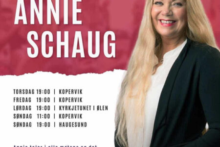 Annie Schaug besøker Troens Ord 23-26 oktober 23 til 26 oktober kommer Annie Schaug som er kjent for mange her på Haugalandet. Annie har besøkt oss jevnlig gjennom årene og har en forkynnelse som er profetisk og kraftfull. Annie har skrevet flere bøker, forkynner i mange ulike sammenhenger og har ett aktuelt budskap hver gang ho kommer. Annie har også ett sterkt vitnesbyrd om hvordan hun har vært bundet av mørke og involvert i mye ondskap, men så møtte ho…